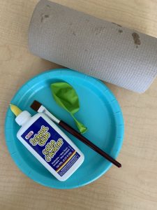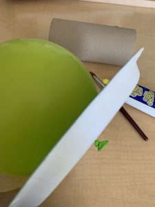 Percer l’assiette de carton à l’aide d’un crayon et insérer le ballon. Ce sera plus facile et stable pour l’enfant de mettre la colle et le papier.