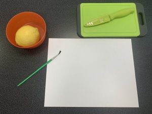 Vous aurez besoin d’un citron, d’une feuille de carton et d’un pinceau. (à la place du citron, vous pouvez aussi utiliser du lait 3.25%)