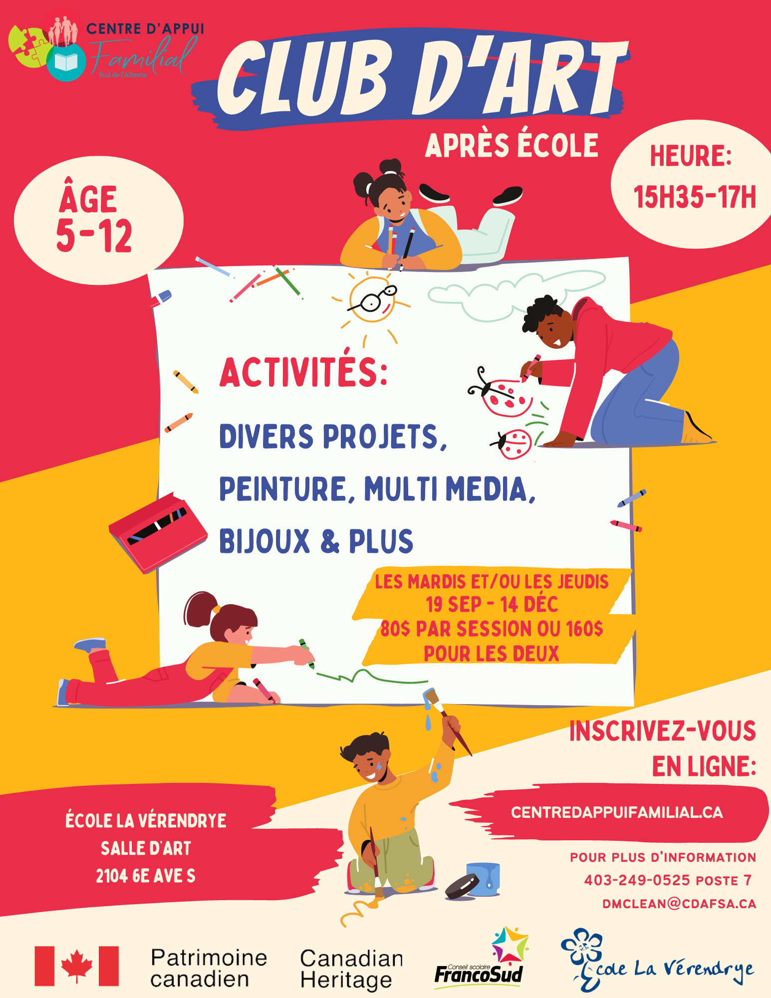 Libérez l’artiste qui sommeille en votre enfant avec notre programme artistique parascolaire. Nous ferons preuve de créativité avec une variété de matériaux et de nombreux projets à emporter. Nous sommes plus concentrés sur le processus artistique que sur le résultat. Nous pensons que donner aux enfants un espace pour expérimenter et faire preuve de créativité permettra à leur imagination de s’épanouir.