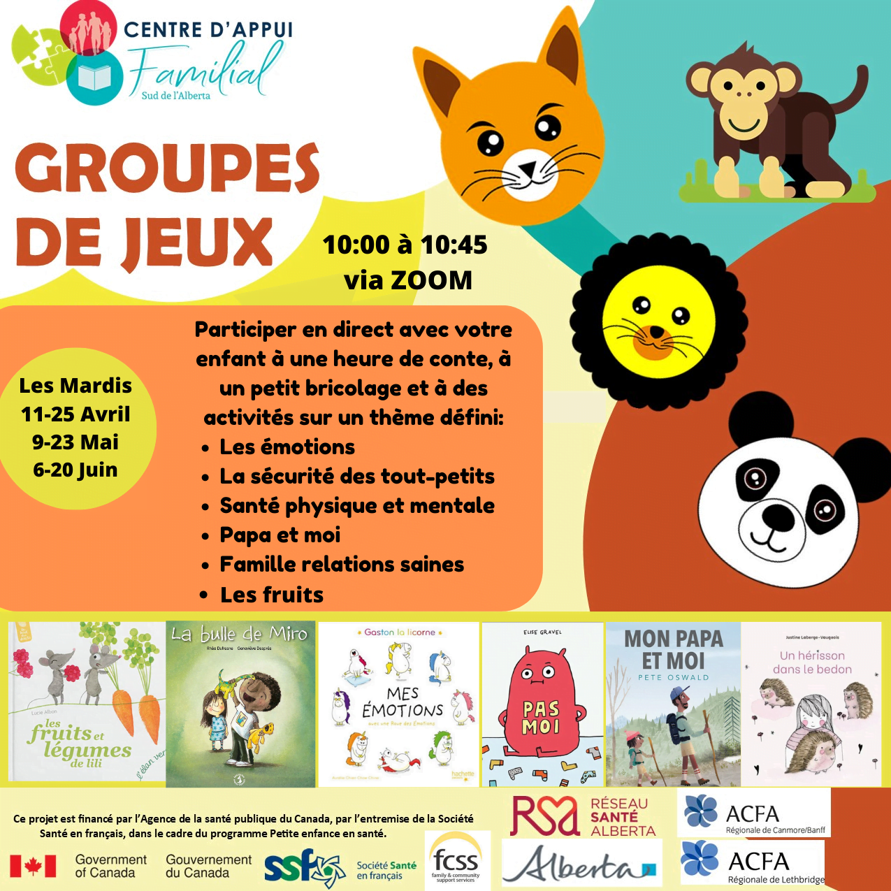 Chaque séance, une trousse avec tout le matériel nécessaire pour faire les activités vous sera envoyée par la poste. Veuiller noter que pour les nouvaux participants, une trousse de base sera aussi disponible gratuitement. Elle contiendra tout le nécessaire pour colorier et bricoler à la maison: crayons de couleurs, pâte à modeler, colle, papier etc.